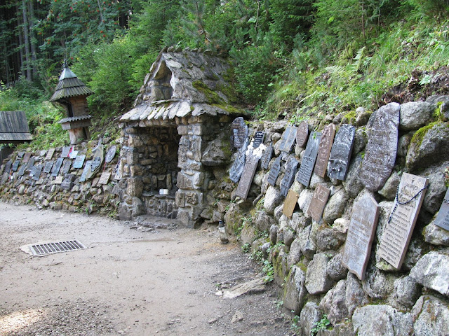 jednak poszliśmy. Droga wokół jeziora prowadziła pod Osterwą do miejsca szczególnego. Na blokach skalnych przytwierdzone około 200 tablic upamiętniających ludzi, którzy zginęli w górach. Jest tam około 50 tablic dotyczących Polaków np. Klimka Bachledę. Po środku kapliczka oraz liczne drewniane etniczne krzyże.